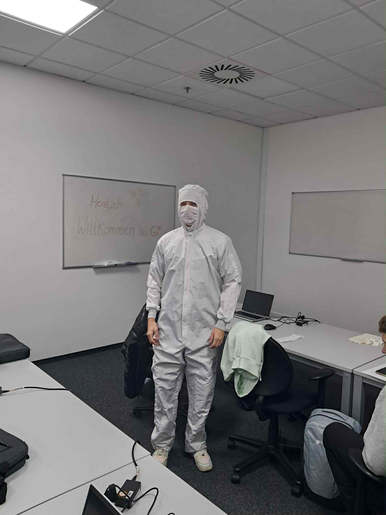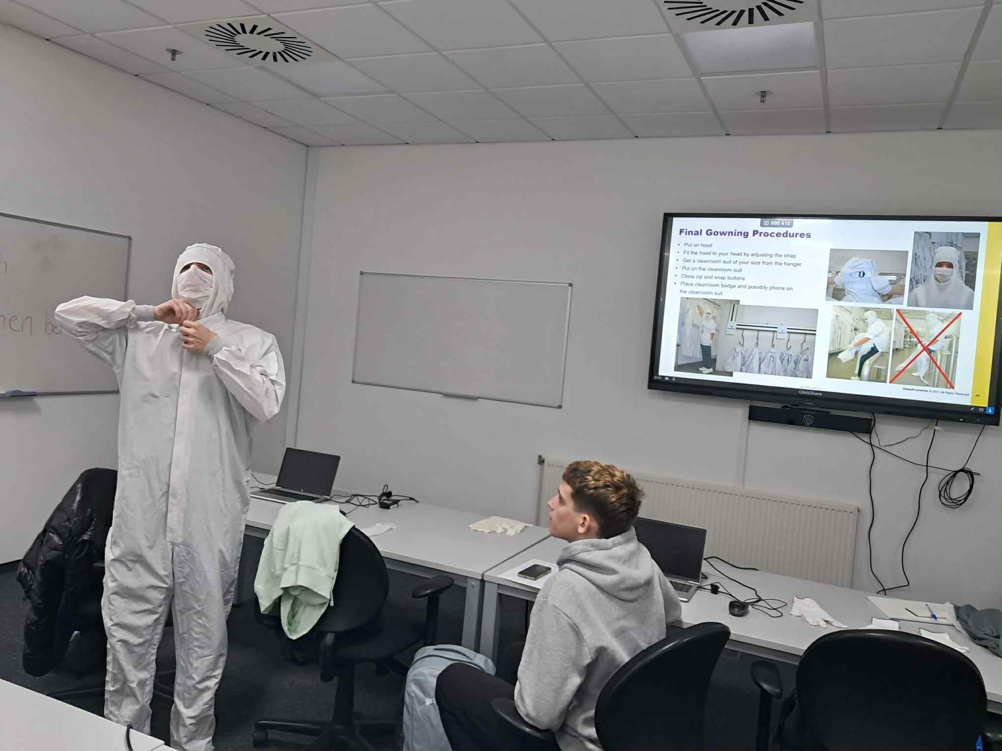 Podczas wizyty w zakładzie mieliśmy okazję zwiedzić pomieszczenia typu clean room, w których powstają nowoczesne układy scalone. Przebieraliśmy się w specjalistyczną odzież ochronną i poznaliśmy zasady panujące w środowisku o wysokiej czystości. Zwiedzanie fabryki pozwoliło nam zobaczyć z bliska nowoczesne linie produkcyjne, maszyny oraz systemy automatyzacji, które są podstawą przemysłu półprzewodnikowego.